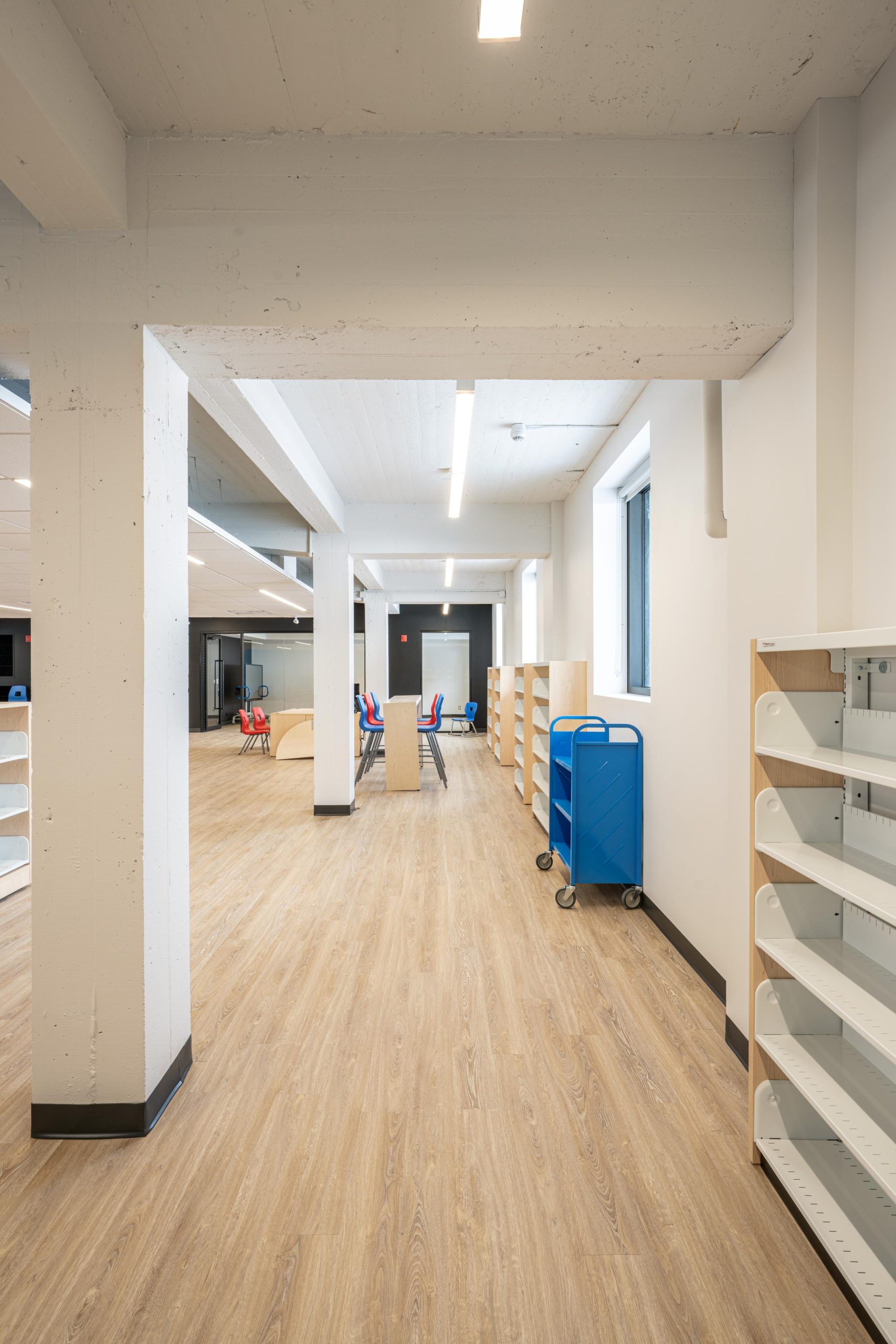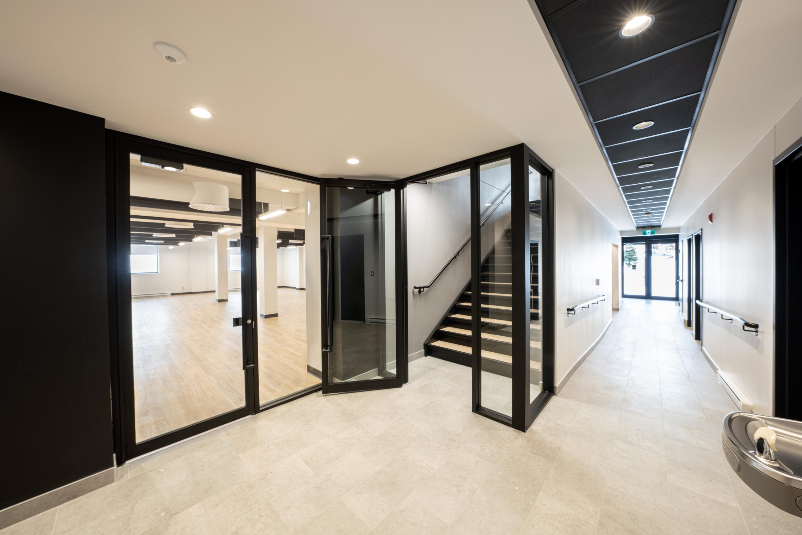 Un agrandissement sur le côté gauche du bâtiment a permis de créer une nouvelle entrée principale dotée de services modernes et d’un ascenseur, assurant une accessibilité universelle à l’ensemble des espaces communautaires et à la bibliothèque.