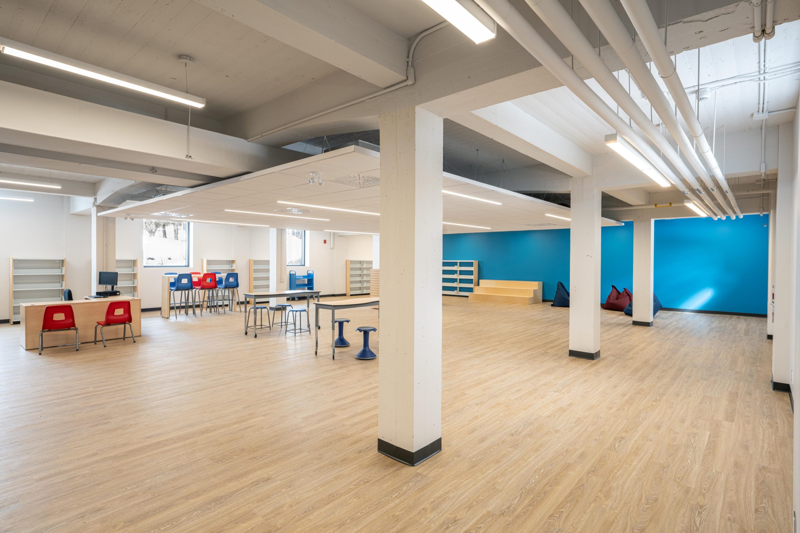 Au niveau de la Chapelle, la grande salle polyvalente a été transformée en bibliothèque municipale et scolaire, offrant désormais un lieu lumineux et accueillant pour le partage du savoir et la vie culturelle locale.